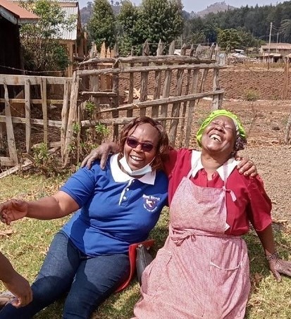 Palliative Care Nurse Gladys from Meru Hospice and cancer patient, Grace, laugh together during a home-care visit